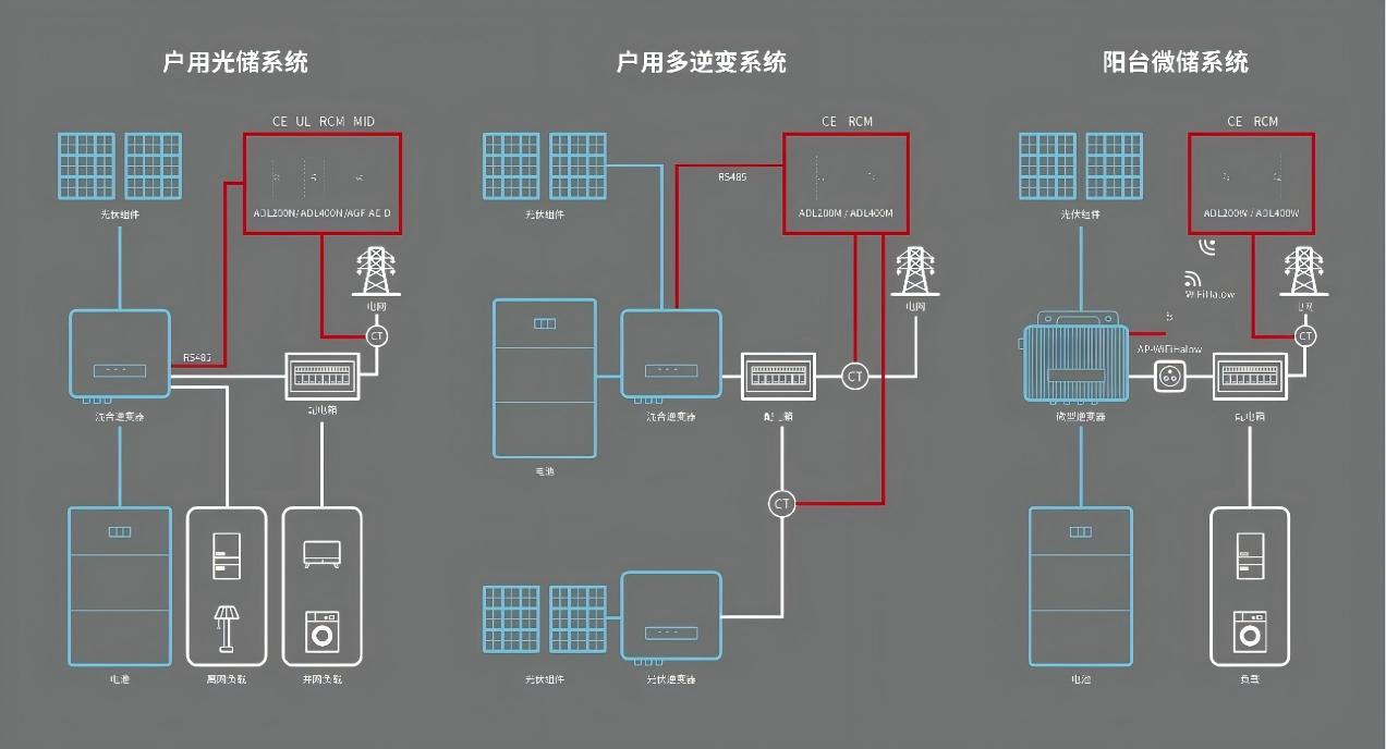 Multi-invertorový domáci systém: V rámci základného FV/akumulačného systému sa dodatočne namontuje ďalší FV/akumulačný systém, aby sa vytvorila konfigurácia s viacerými invertormi. Merače ADL interagujú s hlavným hybridným invertorom monitorovaním pôvodnej výroby PV a prúdu v bode pripojenia k sieti, aby sa dosiahla funkcia monitorovania spätného toku.