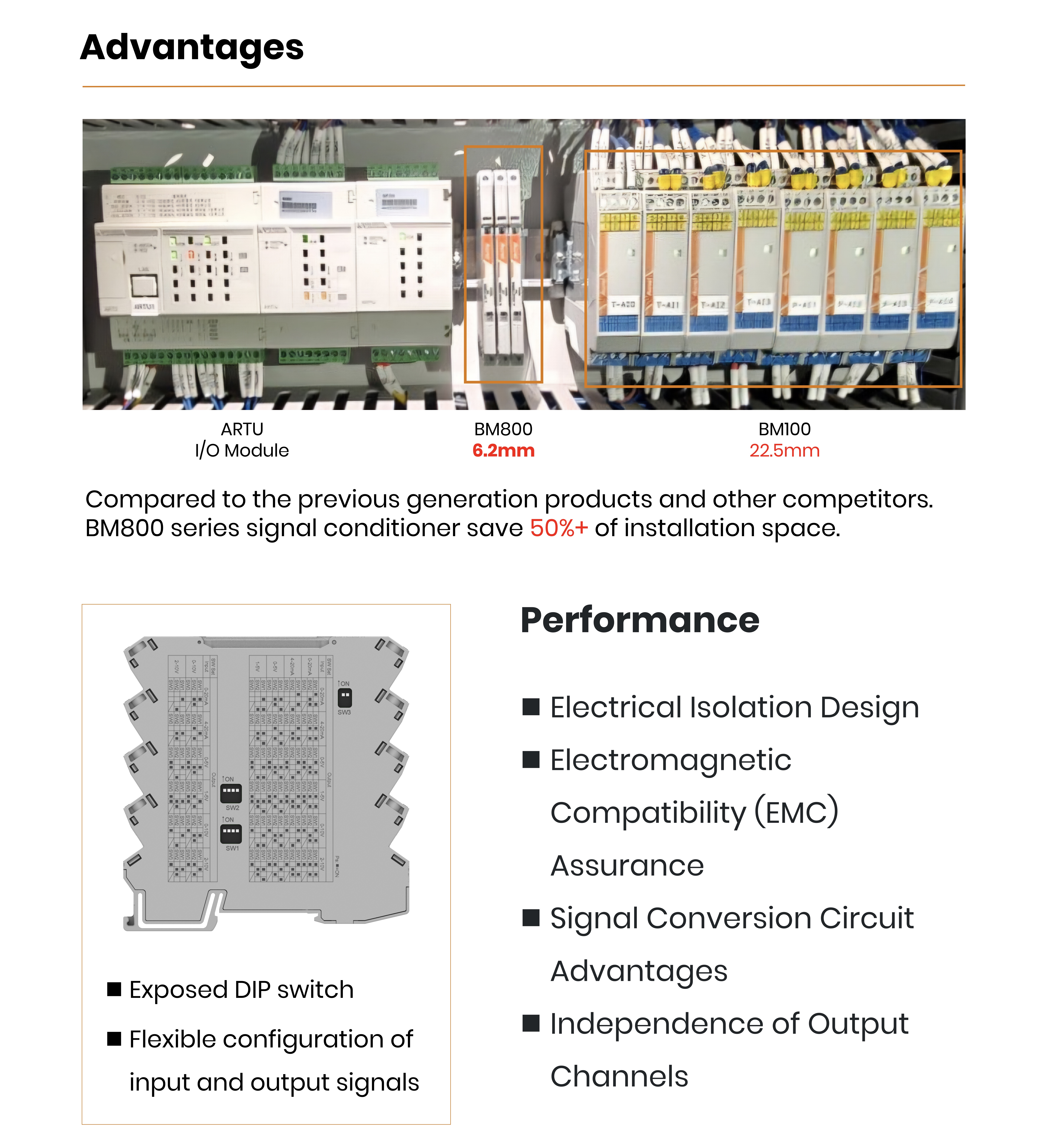 Kondicionér signálu série BM800, ktorý je tiež známy ako izolátory signálu, prevodníky signálu a prevodníky signálu, je pokročilé priemyselné zariadenie na úpravu signálu so super tenkým 6,2 mm dizajnom, ktoré šetrí viac ako 50 % inštalačného priestoru. Môže sa pochváliť presnosťou 0,1 %, zárukou elektromagnetickej kompatibility a funkciami, ako je elektrická izolácia, výhody obvodu na konverziu signálu a nezávislé výstupné kanály. S prepínačom DIP pre flexibilnú konfiguráciu vstupného a výstupného signálu dokáže spracovať rôzne signály, ako napríklad 0/4~20mA, 0/1~5V, atď. Má tiež vynikajúci výkon pri teplotnom posune, dobe odozvy a sile izolácie.
