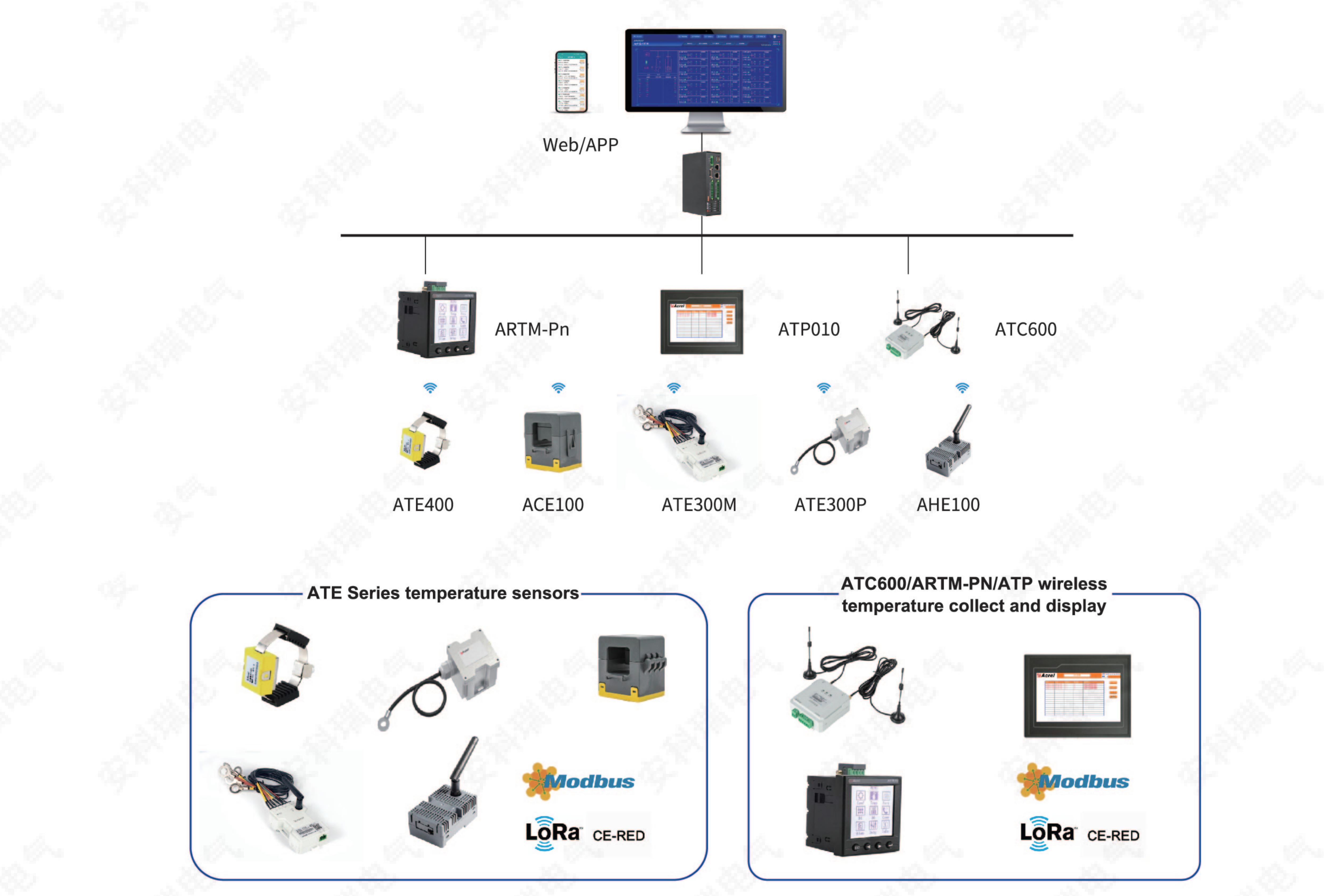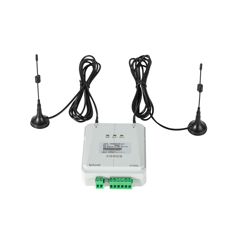 ATC600 je bezdrôtový prijímač na monitorovanie teploty navrhnutý na použitie v elektrických systémoch. Pracuje na frekvencii 470 MHz a podporuje komunikáciu so senzormi na vzdialenosť až 150 metrov a medzi prijímačmi až do vzdialenosti 1 km v otvorených priestoroch. Zariadenie dokáže spravovať až 240 senzorových bodov a je napájané AC/DC 85–264V. Obsahuje dva pasívne reléové výstupy (5A pri AC250V/DC30V) a podporuje komunikáciu RS485 s protokolom MODBUS-RTU, čo uľahčuje integráciu do SCADA alebo vzdialených monitorovacích systémov.